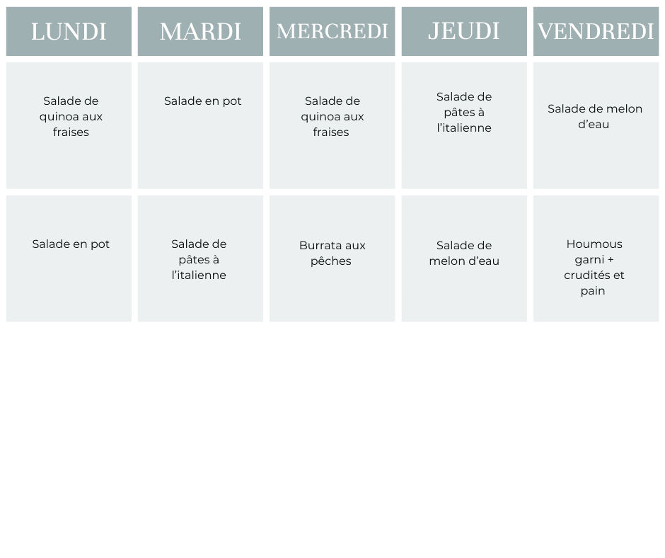 Cette semaine, je prépare à l’avance mes salades en pot ainsi que la salade de quinoa. Je vais en profiter pour cuire mes pâtes, ce qui me facilitera la tâche lorsque je ferai la salade à l’italienne (il restera seulement à assembler). Je pourrais aussi préparer la vinaigrette à l’avance.