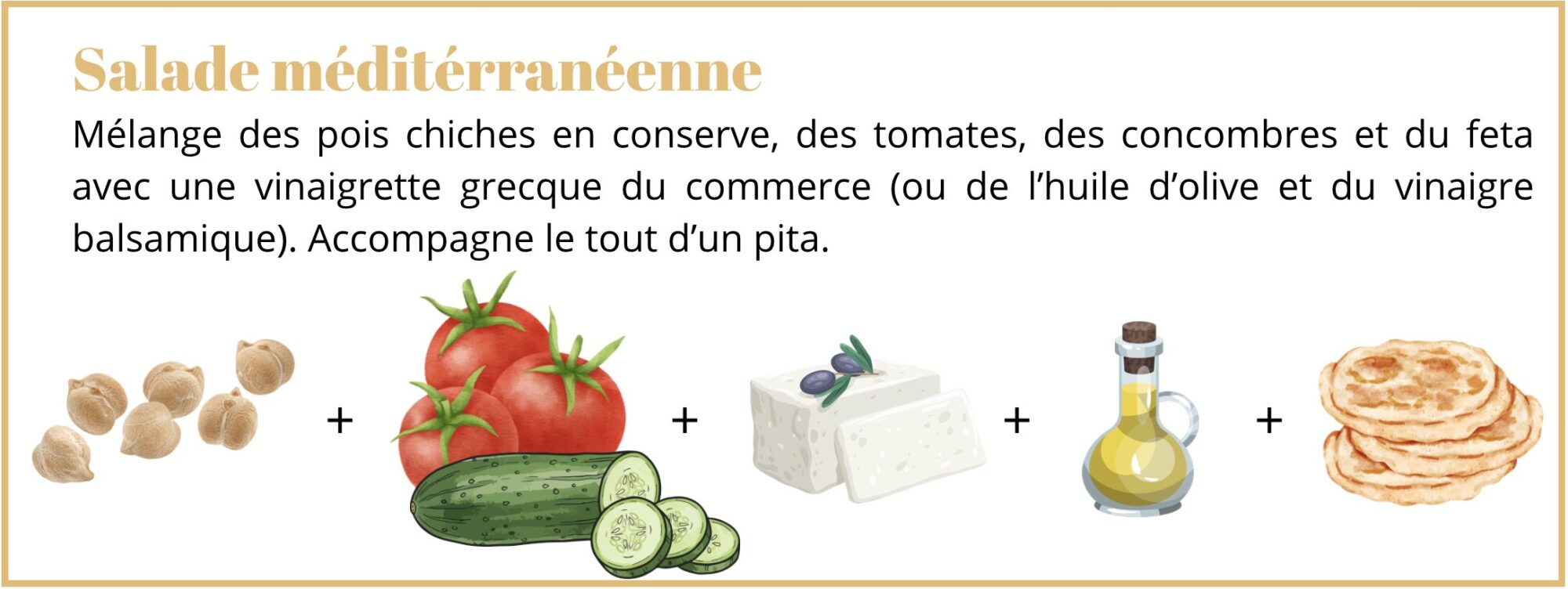 Tu peux te référer à la section ci-dessous pour connaître des idées d’aliments à conserver chez soi pour composer des repas simples.